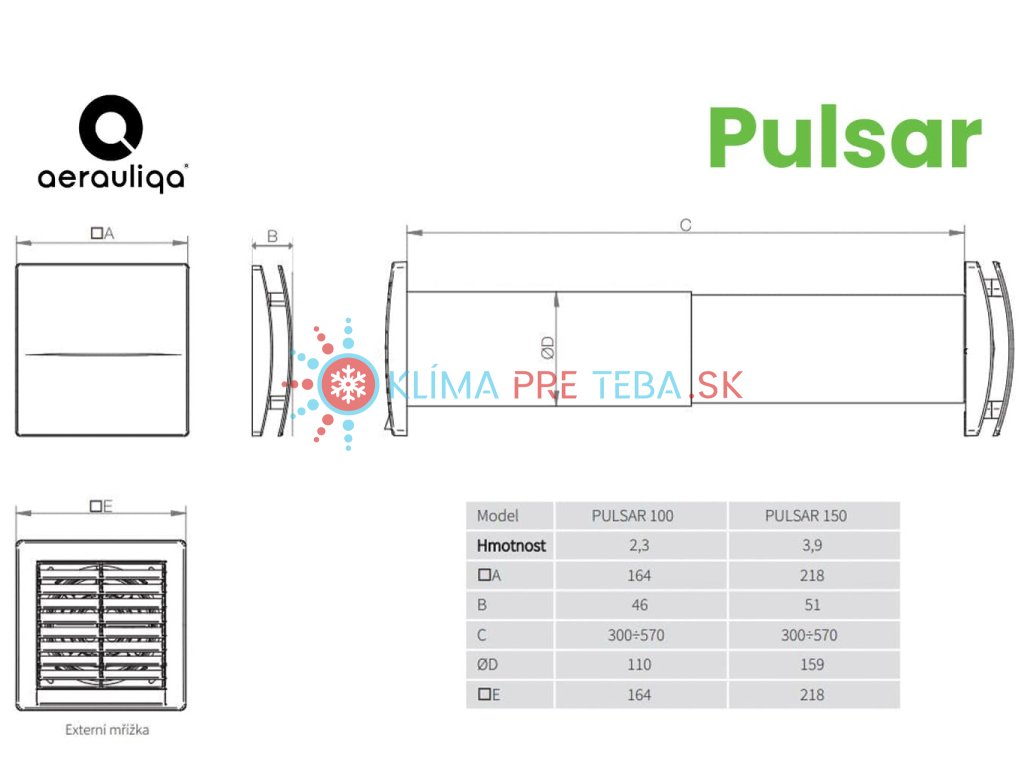 - ✅ PULSAR 150 – vyšší prietok až 60 m³/h, Ø 159 mm, vhodná keď chcete viac vzduchu v jednej miestnosti.