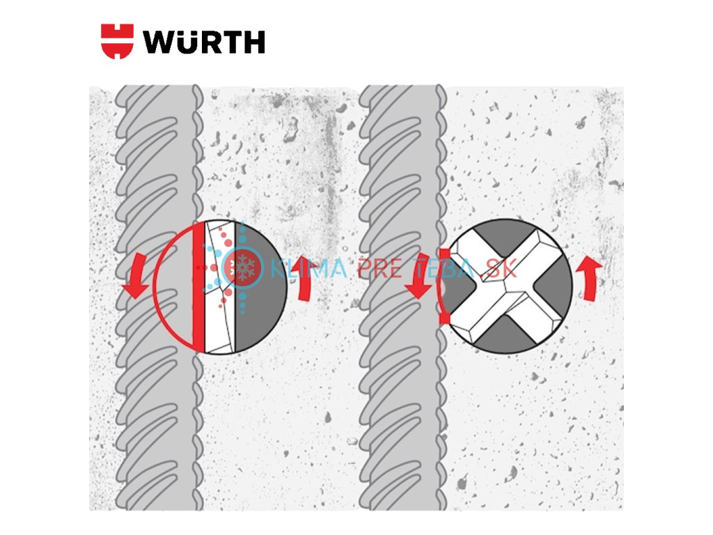 Symetrická geometria rezných hrán 4 x 90° (až do Ø 10 mm s pevnou karbidovou hlavou) zabraňuje zachyteniu vrtáka alebo odkloneniu od stredu napr. pri zasiahnutí výstuží.